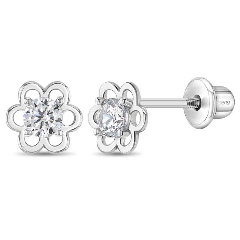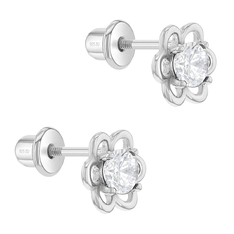 Zilveren kinderoorbellen bloemetje met zirconia steentje | schroefsluiting